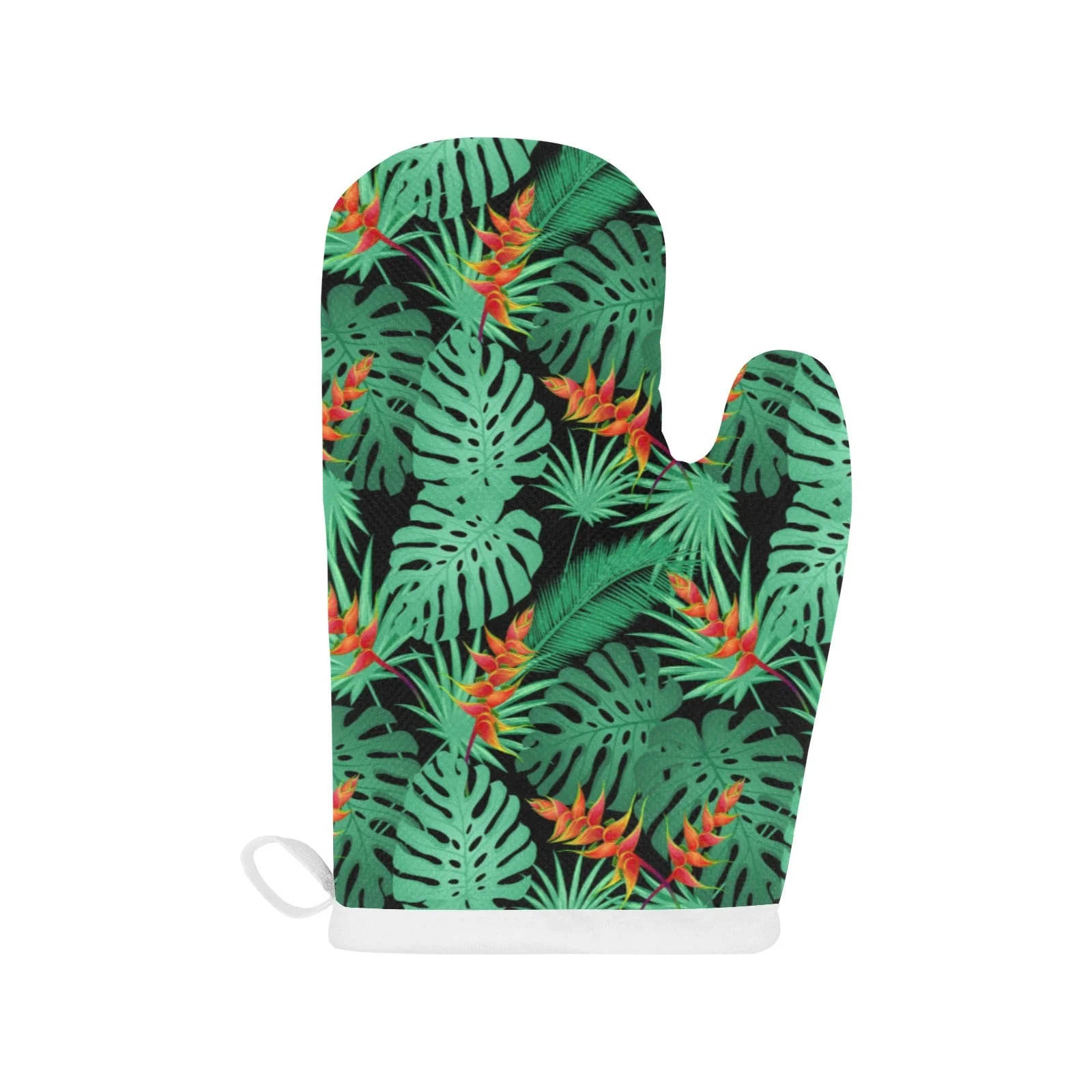 Heliconia Flower Palm Monstera Leaves Black Background Heat Resistant Oven Mitts Pot Holders Set